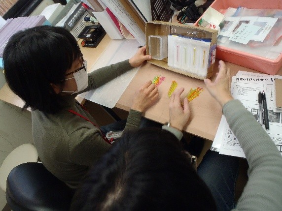 今月は、「視覚支援を使用した柔軟性と般化」について学んだあと、【自立課題の同じマテリアルで指示を変化させる】ことにチャレンジしました。2,3人のグループになり、自立課題を選び、自立課題を作り直しました。例えば、プットインを色分別に、組み立てを分解に…といった感じで指示を変化させた新しい課題が出来上がっていました。