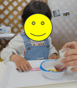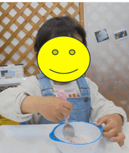 いろはの小さいお子さんは、初めての体験で、何が始まるんだろうとドキドキしている様子がとても可愛かったです。ぐるぐるかき回していくうちに不思議と固まっていくフルーチェに笑顔がいっぱいでした。お家でも作ってみたそうです。