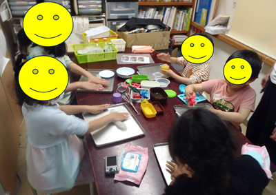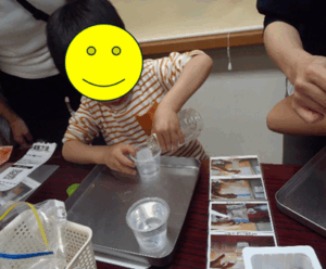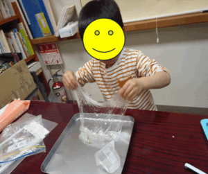 5月の土曜日は、スライム作りをしました。年長さんから4年生の利用児さんが一緒に活動しました。最初に写真入りの手順書を見ながら一斉の説明を受けた後、小学生の利用児から順番に作り始めました。
