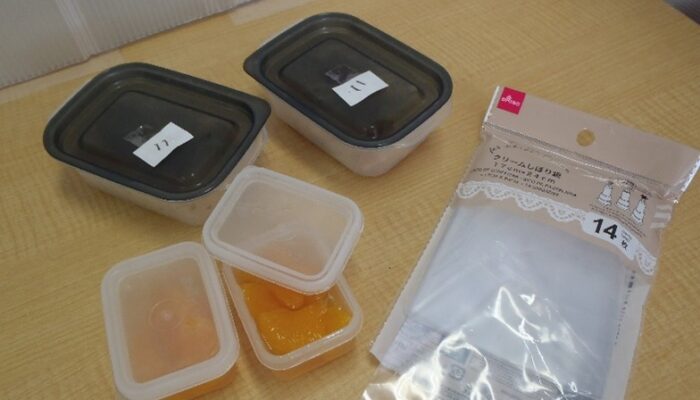 果物などの材料は、一人分ごとにそれぞれタッパーへ小分けにしています。子どもたちが手順書を見ながら自立的に作れるだけでなく、素手で触らなくても作れるようになっています。生クリームもその都度解凍し、極力複数の手を介さなくて良いよう、毎日絞り袋を新しく取り替えるようにしました。材料は、開封時期や保存期間にも気を配りながら、その日の朝に利用人数分を準備しています。また、子どもたちのスケジュールにも、おやつや調理前は「手洗い・消毒」を入れ、子どもたち自身の衛生習慣の定着につながればと思っています。