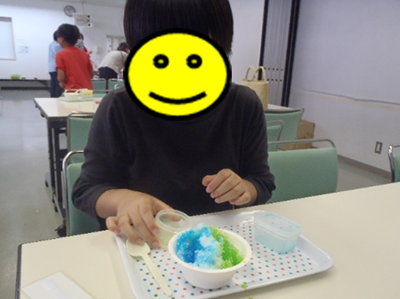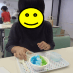 かき氷作りでは、シロップを4種類の中から好きなだけ選び、オリジナルレインボーかき氷を作りました。PECSブックを用意しておくと、上手にカードでシロップの色を要求してくれる子もいました。