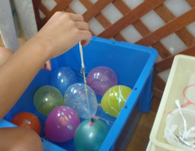 ポイを使ってヨーヨーをすくったり、こよりにつり金具をつけたものでヨーヨーの輪ゴムにひっかけて釣りました。水に濡れるとこよりが切れてしまうので、何回もチャレンジしてようやく釣り上げた時には達成感で満面の笑みがこぼれる子もいました。