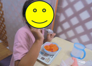 ご褒美はかき氷です。みかんの缶詰めをのせたり、シロップの色を混ぜたりして作りました。がんばった体に染みわたる味で満面の笑みでした。