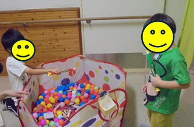 カラフルなボールプールの中にクリップをつけたいろんなお菓子を入れ、自分の欲しいものをめがけて磁石のついた釣り糸を垂らし…言葉やイラストでやり方のわかない子には職員がやり方のモデルを見せることで理解できました。みんな上手に釣り上げていました。