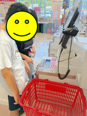 スーパーでは2組に分かれ、写真と同じ食材を探して買いました。セルフレジでは、品物を通す人、お金を入れる人、商品の袋詰めする人など、上手に分担していました。