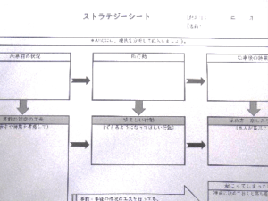 ABC分析では、気になる行動(B)の事前の状況(A)と事後の結果(C)に注目して望ましい行動に変容させていくことを学びました。苦手や得意を考慮して事前の対応を工夫することで、できるようになってほしい望ましい行動に誘導し、事後の結果が本人にとって喜べる活動(褒められる、楽しめる)になるようにします。また、事前・事後の環境の工夫を行っても望ましくない行動が起きた時の対応も考えて記入します。日ごろのアセスメントの中で、事前・事後を意識して行動を観察してみることを共有しました。