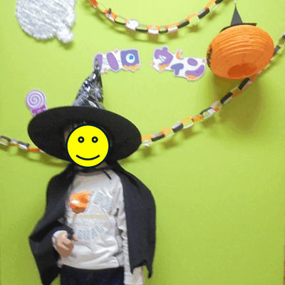 パーテーションに飾りつけをし、マントや魔女帽子、ステッキなどを準備しました。写真を恥ずかしがるお子さんもいましたが、ばっちり仮装して写真を撮っているお子さんもいました。とってもかわいい写真が撮れていました。