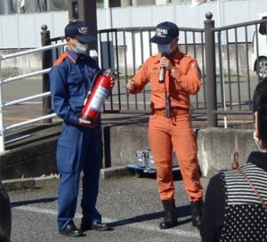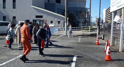 10月29日、新居浜市総合福祉センターの避難訓練がありました。放課後クラブぴあ/療育ルームいろはの職員も参加しました。避難袋を持って、避難場所に集合した後、消防隊員の方から消火器の使い方を教えてもらい、水消火器で消火体験をしました。