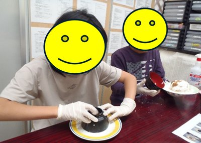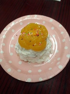 お椀にラップをし、スポンジケーキをつめ、生クリーム、ミカンの缶詰、カラースプレーでデコレーションしました。ゴム手袋もつけ、パティシエさながらに慎重に作業を進めました。出来上がったドームケーキは、思った以上にボリューミーでしたが、ほぼみんな完食しました。