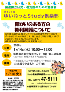 毎月1度(主に第1水曜日)、障がい児者の保護者、支援者、福祉関係の方々が共に学びあう場として、ゆいねっとStudy倶楽部を開催しております。年間を通じて、家庭でできる支援の取り組みや、障がい特性について学ぶ講演会など理解を深めることができます。