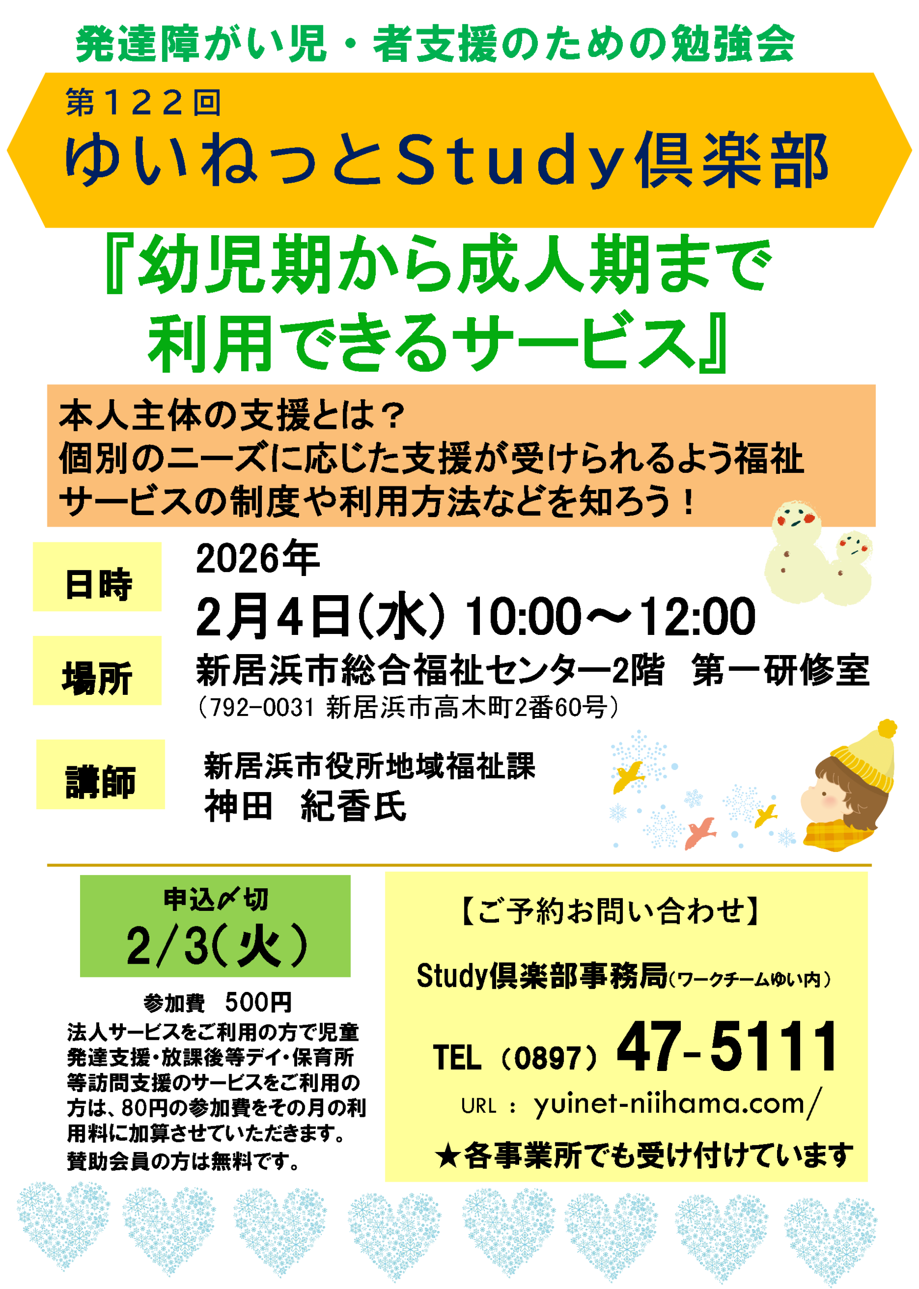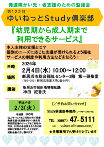 | 2026/02/04(水) | 10:00~12:00 | 幼児期から成人期まで 利用できるサービス ・本人主体の支援とは? ・個別のニーズに応じた支援が 受けられるよう 福祉サービスの制度や 利用方法などを知ろう! ・質疑応答 | 新居浜市役所 地域福祉課 神田 紀香氏 | 新居浜市 総合福祉 センター 2階 第1研修室 | 参加費 一般 500円 サービス利用者 0~80円※1 賛助会員 無料 |