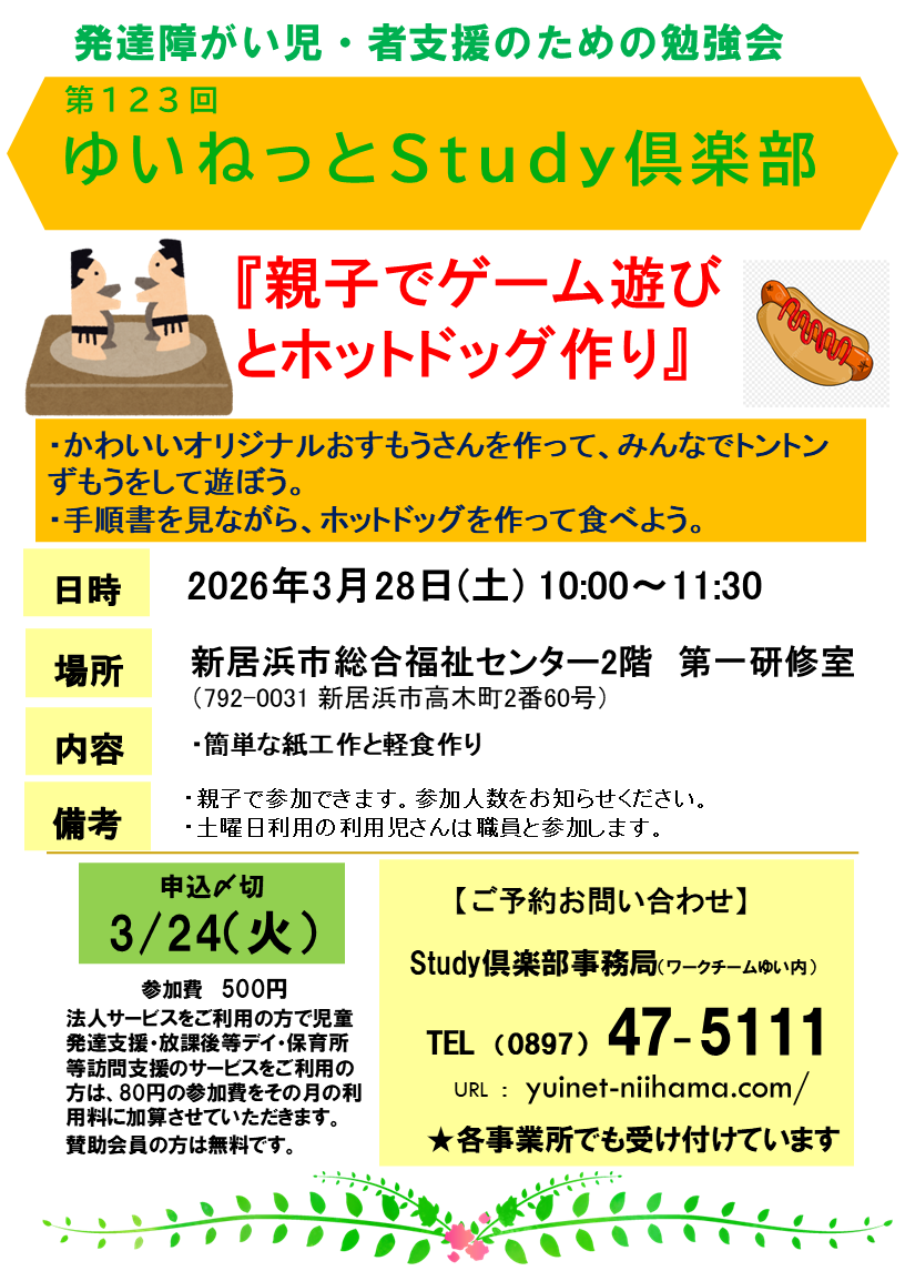 | 2026/03/28(土) | 10:00~11:30 | 親子でゲーム遊び& ホットドッグ作り ・オリジナルお相撲さんを 作ろう! ・みんなでトントン相撲をして 遊ぼう! ・手順書を見ながら ホットドッグを作って 食べよう! ★親子参加OK★ | 特定非営利活動法人 ゆいねっと新居浜 職員 | 新居浜市 総合福祉 センター 2階 第1研修室 | 参加費 一般 500円 サービス利用者 0~80円※1 賛助会員 無料 |