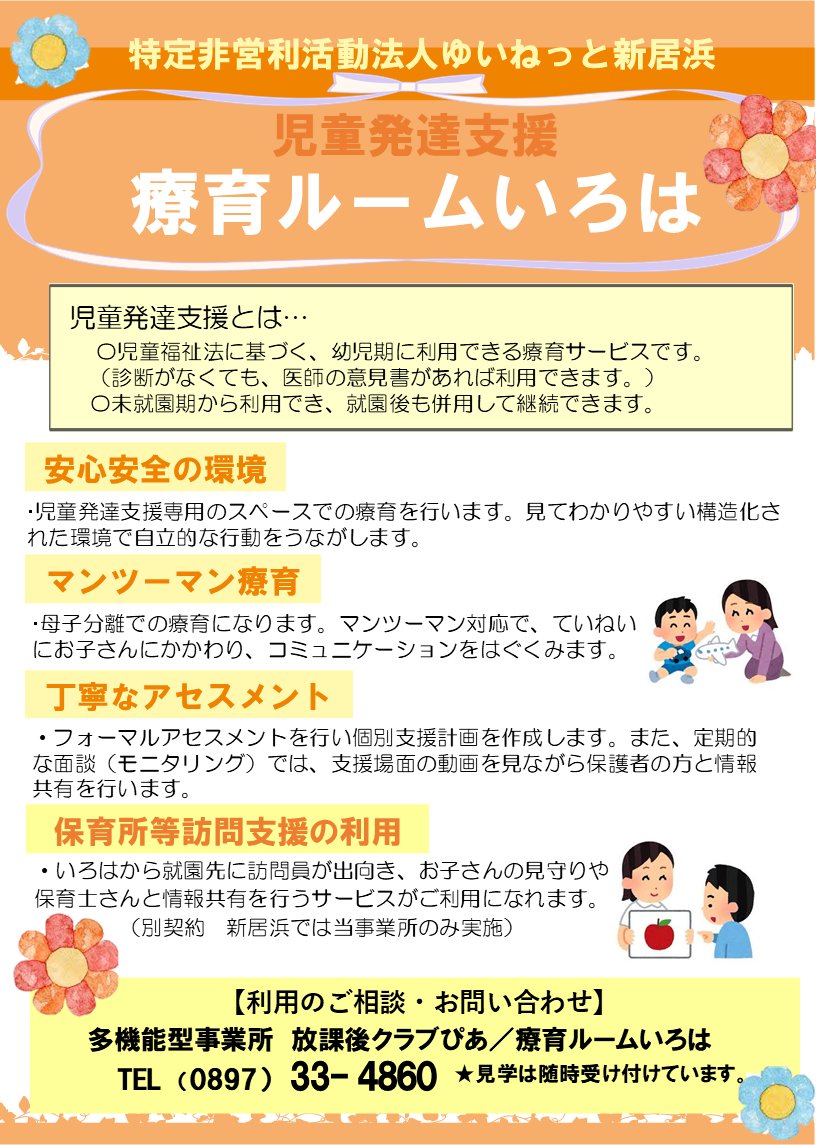 特定非営利活動法人ゆいねっと新居浜では、児童発達支援事業「療育ルームいろは」を運営しています。